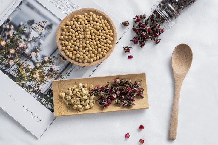 先将黄豆洗净备用,玫瑰花去蒂和叶子,用热水浸泡2分钟捞出沥干水分;