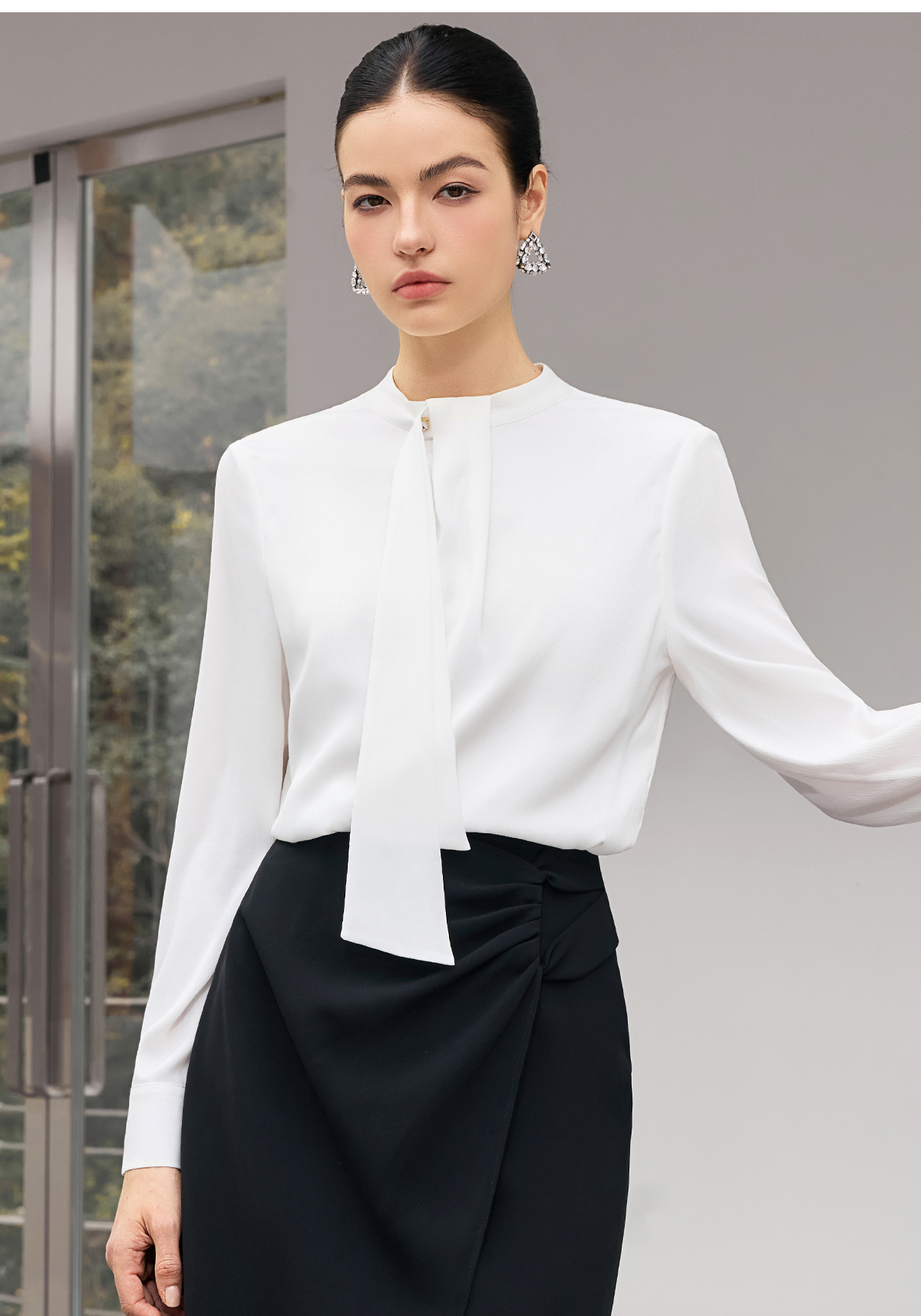 领口的飘带设计,打破了传统衬衫的刻板,轻轻一系,便勾勒出优雅的颈部线条,让你在举手投足间尽显知性魅力。