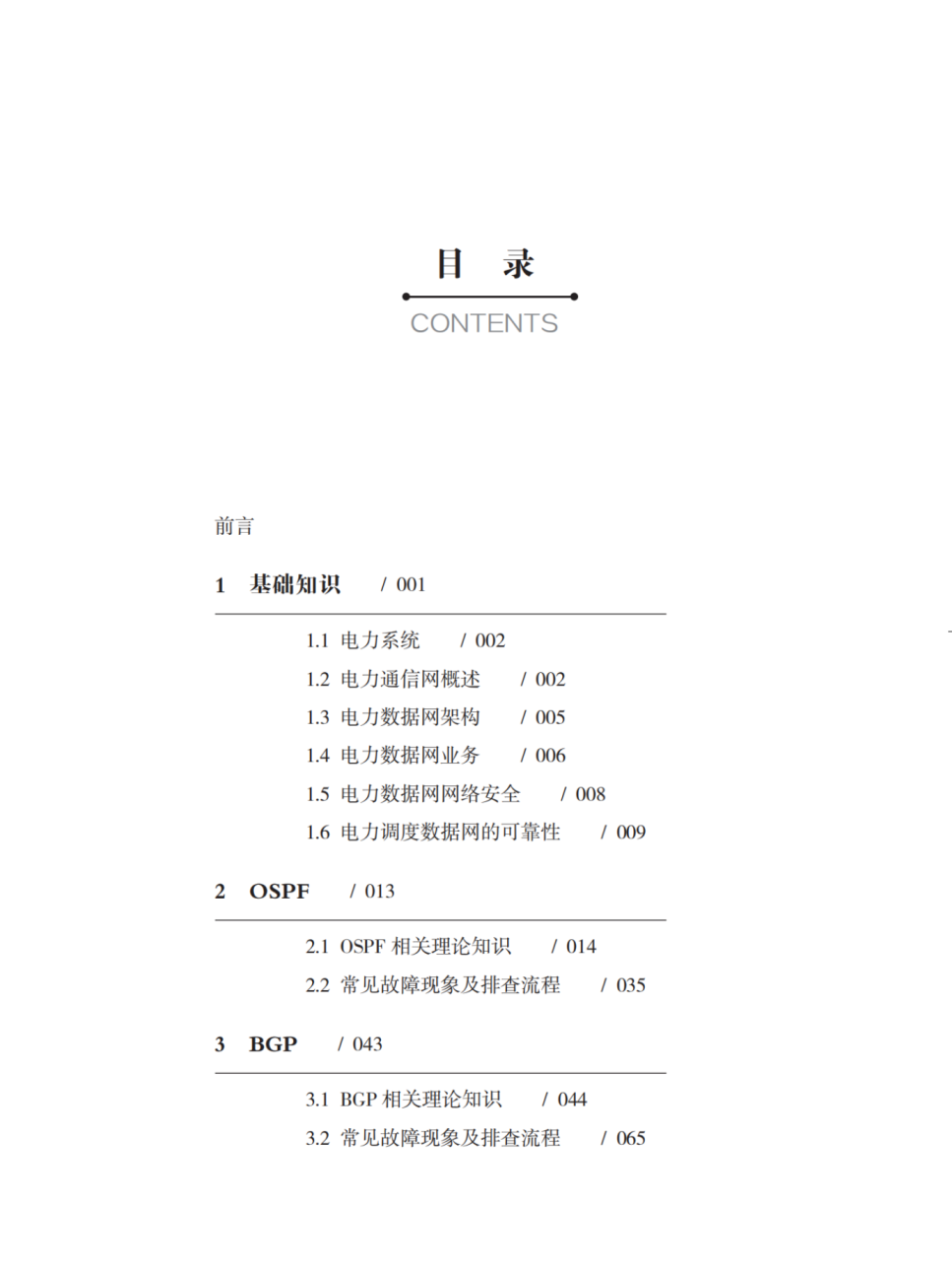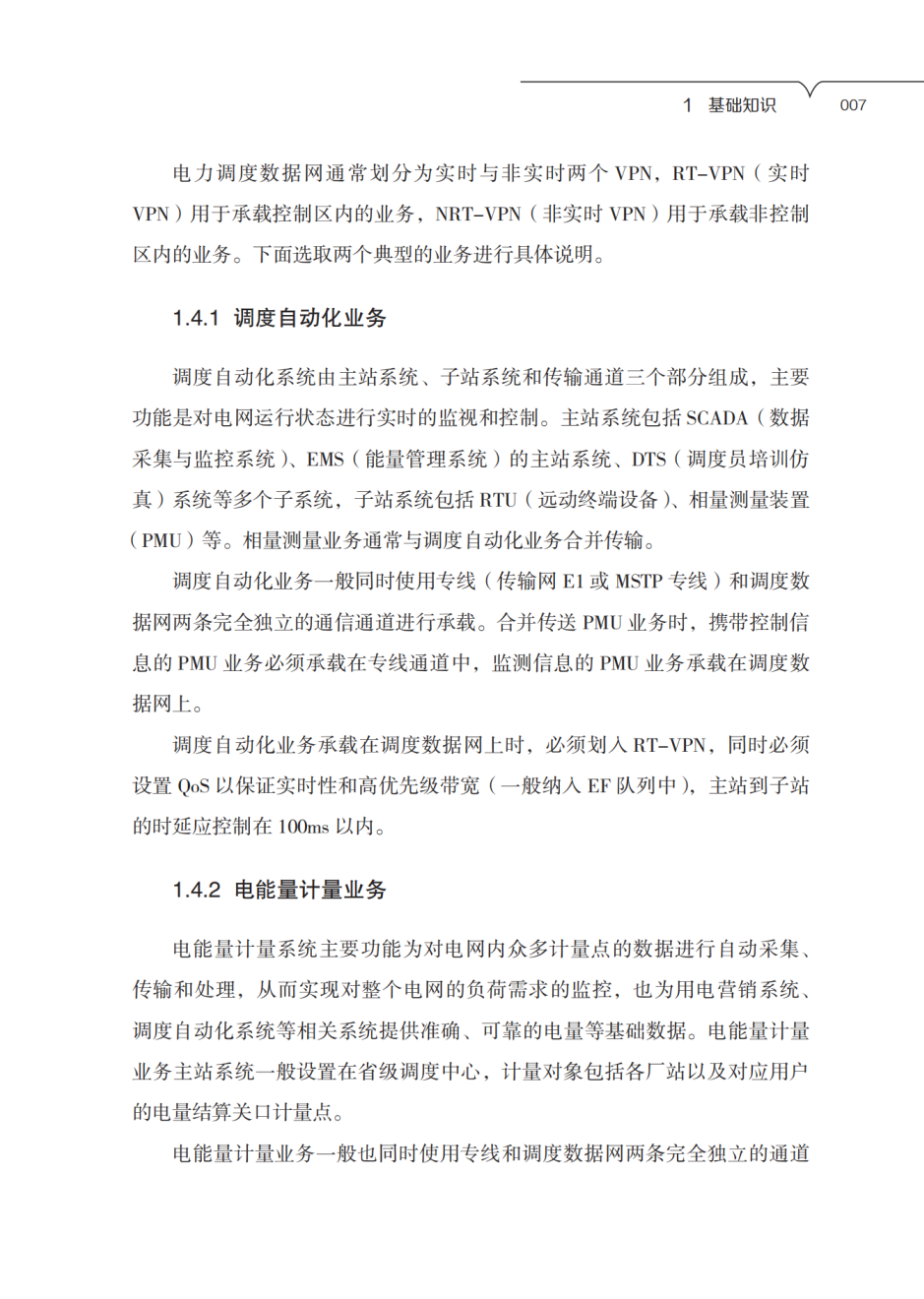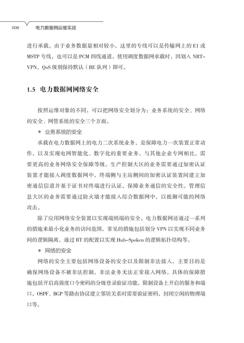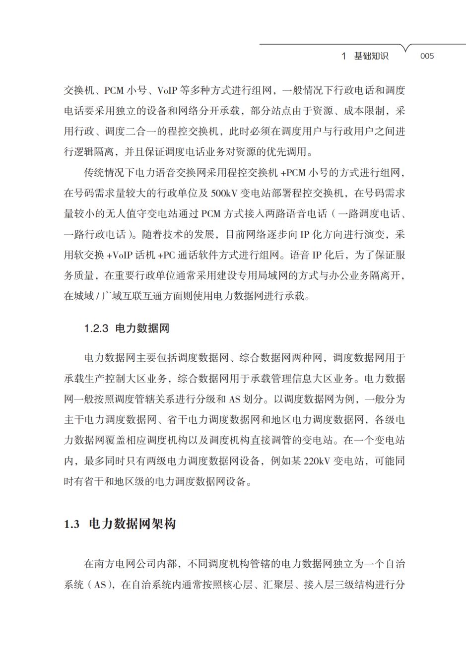 第1章以笔者所在的南方电网公司为例,介绍了电力数据网的网络架构、承载业务以及网络安全防护等内容,从而帮助读者对电力数据网有整体的认识。