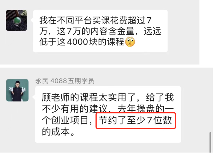 换句话说,我们这些花了4088买的课,你今天只要299就可以拿走,还可以加老顾微信,进入我们的圈子。