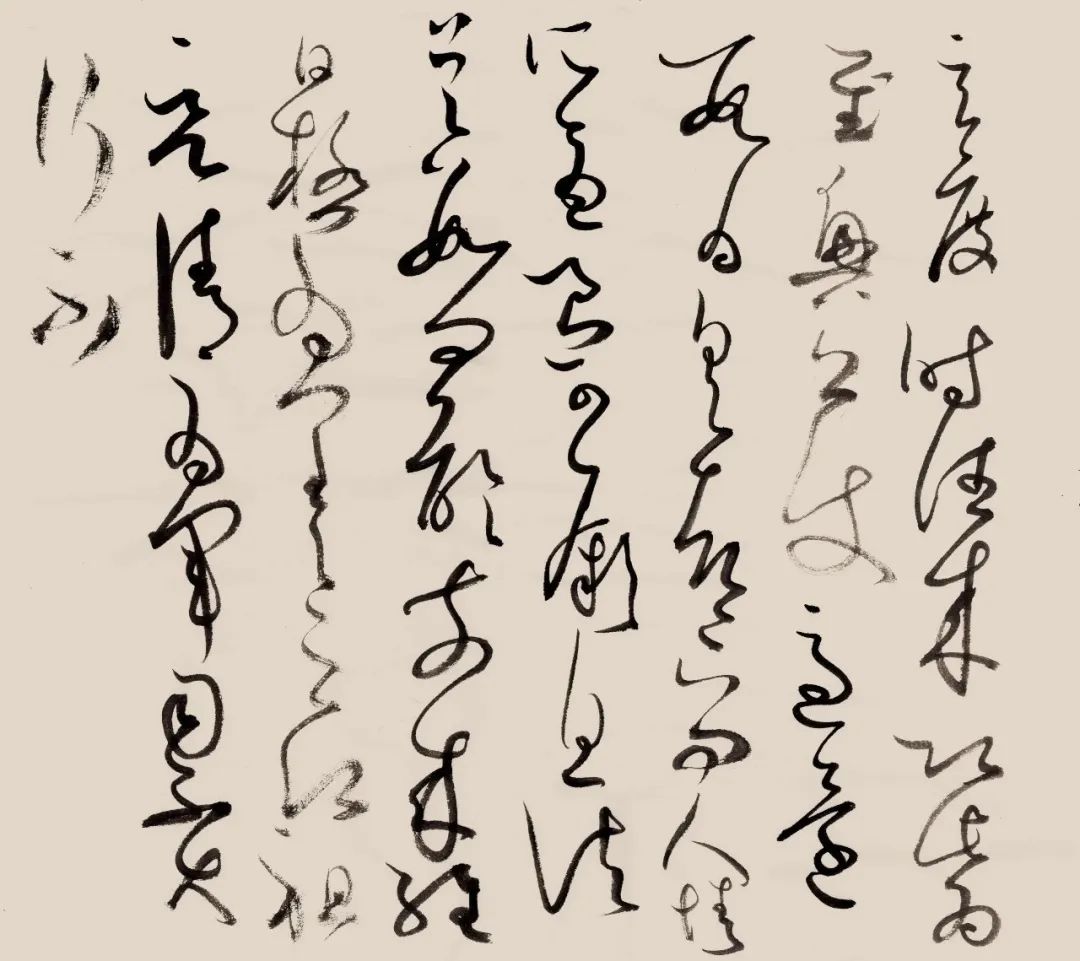 狂草点画起笔收笔多是露锋以承接和启带上下笔画,形成笔势流畅,但更要注意也要适当地运用一些藏、露相杂的笔法,如此方能使狂草在保持线条力度的前提下增加线条形体的多重变化。“草以使转为形质”,多参考篆书的笔法,把篆书的环转笔法尽可能地运用到狂草的笔法中去。在使转书写中充分运用提、按、顿、折、翻等笔法,起调换笔锋,增加使转回环变化的作用,对于提高狂草造诣水平是十分重要的。