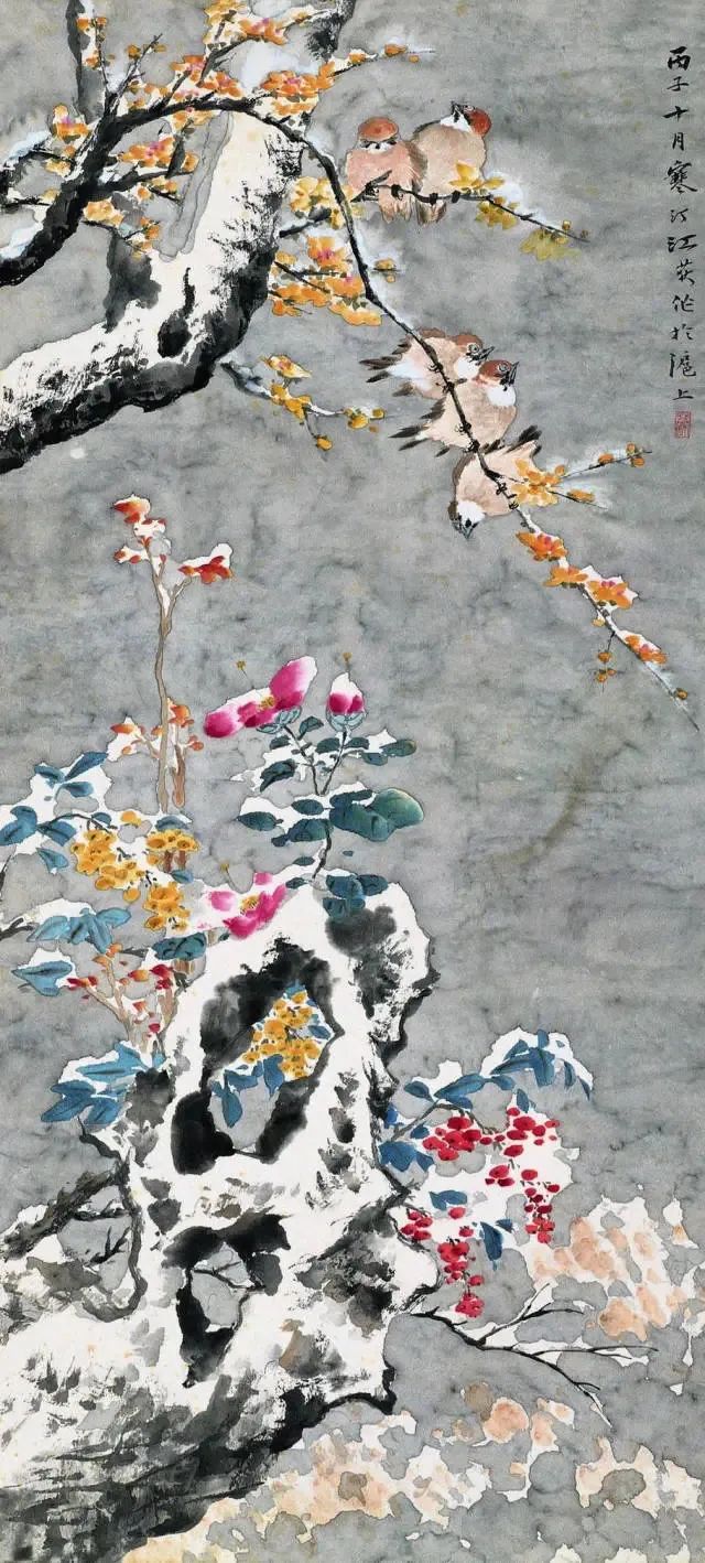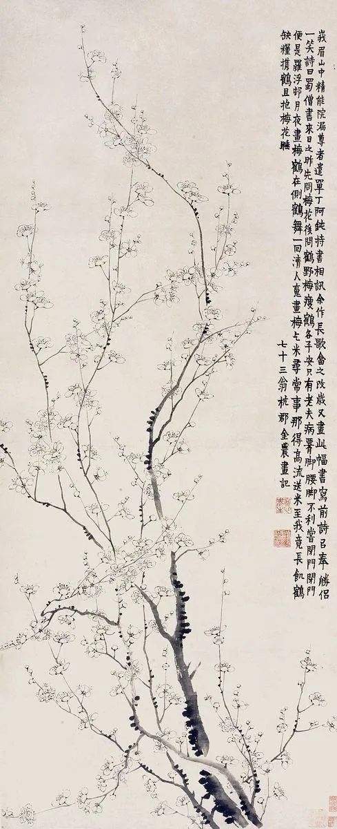 画梅有粗细,墨中要见笔,顿挫与顺逆,枝中要求曲。枝干应穿插,画枝如写“女”。叠花似“品”字,分组菊疏密,攒三和聚五,主宾莫分离,俯仰与向背,用色需统一。