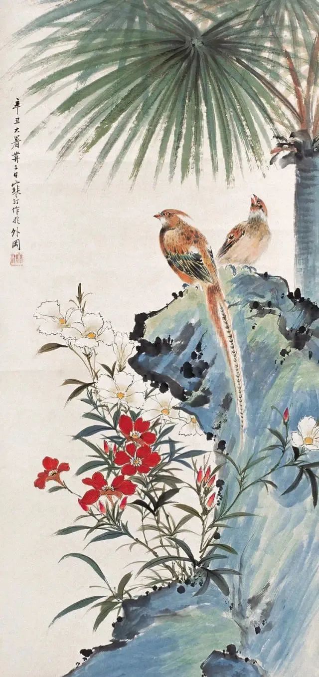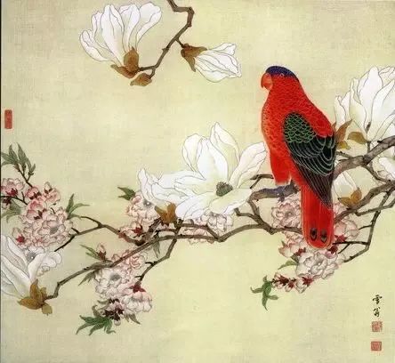 初春皎洁玉兰花,九瓣花冠肥且大。淡墨勾写可中侧,正侧反转多变化。石绿朱砂点雌蕊,雄蕊上色需变法。赭石调墨点花萼,数笔茸毛不细耍。立在枝头如玉盘,不受尘垢生光华。