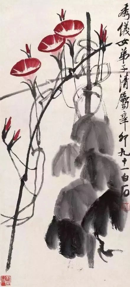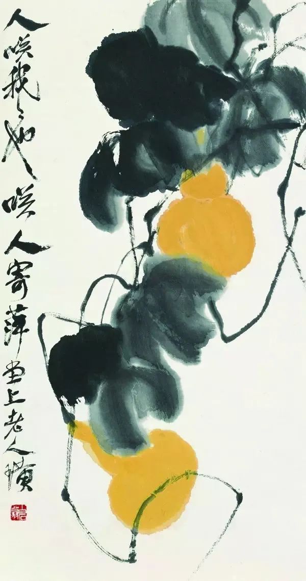 刻画葫芦侧锋点,颜色要浓笔要软。藤黄调绿偏冷色,调赭调红色调暖。适当分出深与浅,勾勒轮廓要自然。颜色半干点果脐,浓墨点写不求圆。心脏形叶可破散,有虚有实有浓淡。侧锋取妍求巧力,精神松驰意态宽。