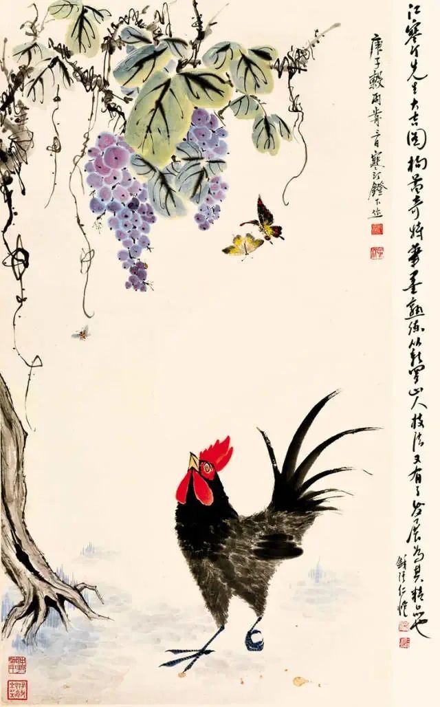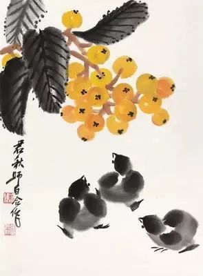 先画果实后画叶,最后再来串枝干。主宾疏密远和近,向背虚实要记全。叶子用墨不用色,稳重雅致又自然。布局躲开四个角,出枝不要边中点。画枝中侧要结合,提按毛涩粗细间。有开有合是规律,所有枝干都是然。