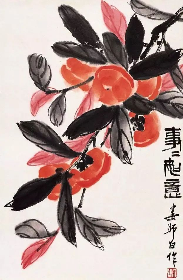 落叶乔木柿垒垒,美好红火意相连。画柿可用朱标点,略调藤黄分深浅。上边四笔下一笔,侧背两笔即画完。笔触不必都明显,把握大形立体感。叶子较大椭圆形,只是陪衬不求全。墨笔成形力沉稳,适当复笔也自然。