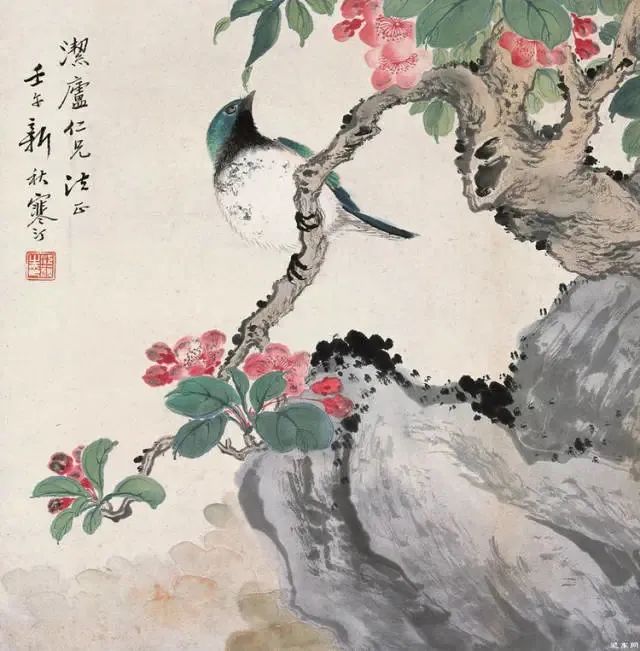 先用淡墨勾花冠,用笔潇洒忌呆板。攒三聚五相错落,有虚有实有连断。花蕾开放相配合,立于枝头神气显。枝干用笔需顿挫,方硬转折在枝端。花青淡赭来勾染,如填白色莫伤线。