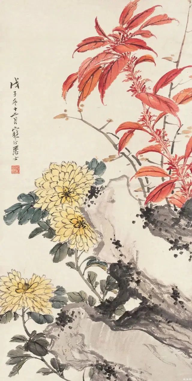 菊叶用笔侧锋点,圆中有方形不简。叶面半干匀叶脉,有提有按要果断。攒三聚五连成片,有疏有密有重点。叶子墨色不可平,应分干湿与浓淡。有虚有实有破散,根据动势来裁剪。不看花冠只看叶,繁简搭配也美观。