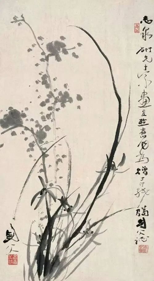 叶丛之中抽花茎,花有俯仰有舒展。可以全露也可藏,有高有低要自然。浓墨画叶淡墨花,淡墨也须有深浅。浓墨点蕊如写“山”,浓淡对比夺人眼。草绿调红画花头,色彩对比校明显。赭石蘸红点花冠,色彩和谐亦自然。只要黑色搭配好,画兰高雅不俗艳。