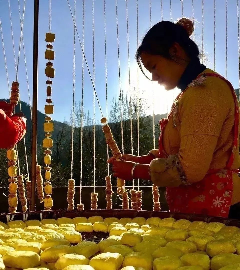 染色好的豆腐,还要一个个悬挂起来晾晒。