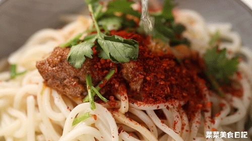 秘制辣椒粉精选陕西秦椒,肥厚辣红,辣中带香,还有秘制的卤肉臊子,还能看到一块块肉,料超足。