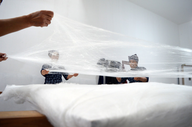 7、拉棉。拉棉看起来简单,做起来非常不容易。每一床蚕丝被都要求四个人均匀用力拉扯,依照密度需求,不强不弱,不急不慢。4位阿姨相互默契配合,经过多年磨练铸就的手法,把蚕帽拉成厚薄均匀的长丝蚕丝网,层层叠加,才能行成均匀平整,薄厚均匀的丝胎。
