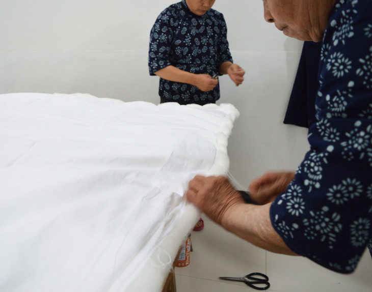 在来桐乡考察之前,我看过文献记载中说在盛唐时期宫廷里已经开始使用蚕丝被。到了明清时期,蚕丝被已经在上流贵族社会中得以流行。但当时的蚕丝被价格昂贵,仅仅是达官贵人身份的象征。当初还不太理解,在王阿姨家观看了蚕丝被的整套制作工艺之后,更加认可了文献的记载。因为一床蚕丝被里面倾注了每一位老手艺人的心血,每一床被子真的是来之不易。