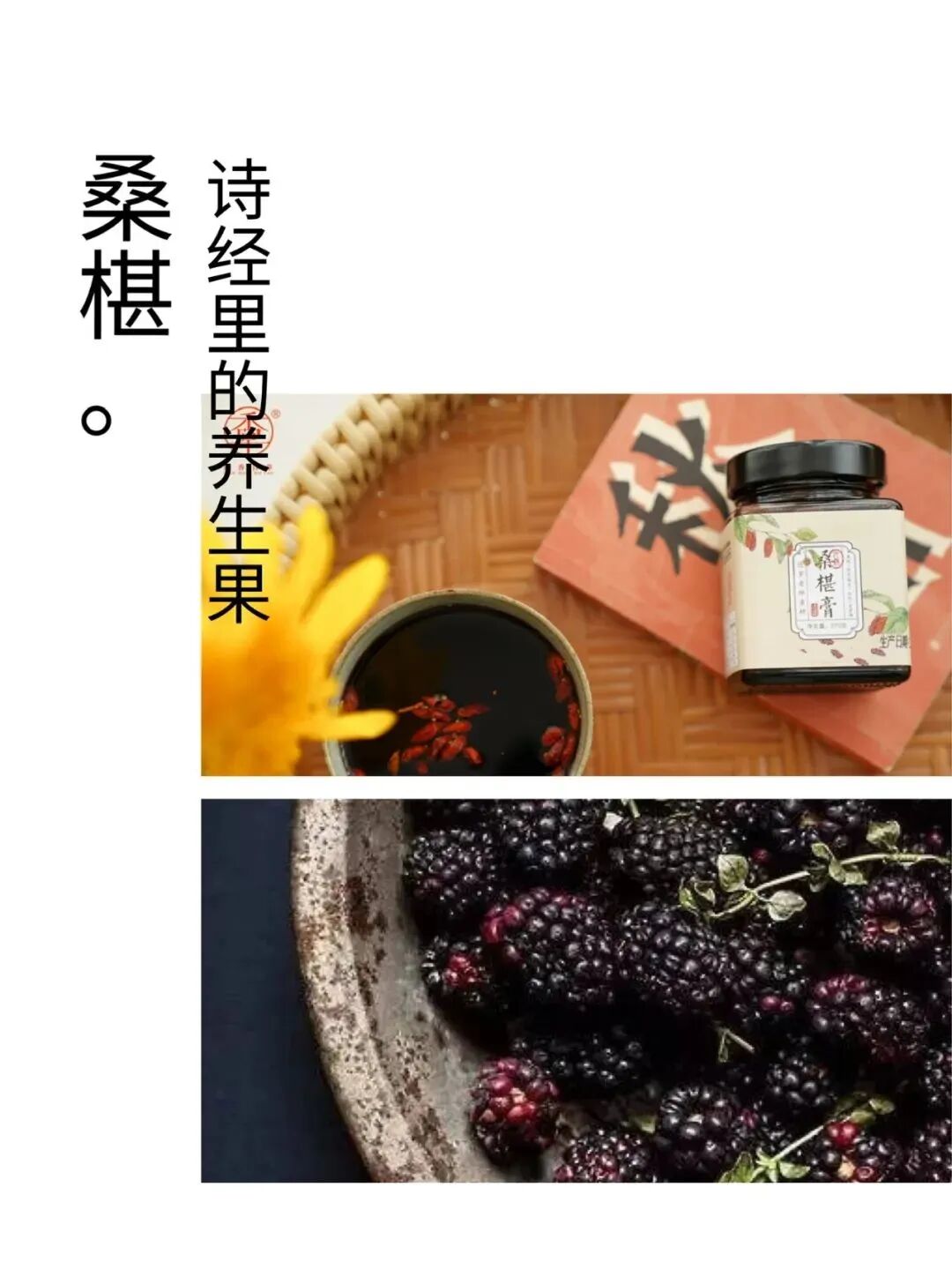 我们的桑椹膏。遵循“君臣佐使”的组方理念,以桑椹为君、佐以性味甘平之枸杞,再配以味苦性温之陈皮,力求达到补泻平衡,相得益彰。