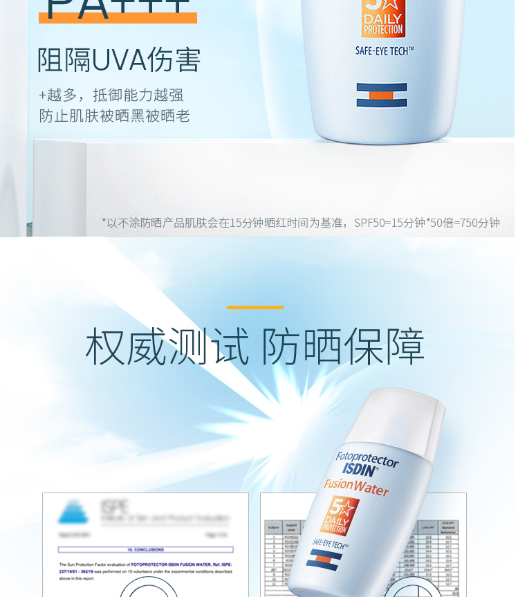 这一款防晒水和其他的防晒产品不同的是,它拥有4大创新优势,SPF50+SPF+++能够有效抵御UVA和UVB;温和无刺激,敏感肌可用;无泪的配方更呵护眼周;防水防汗,湿肤补涂。