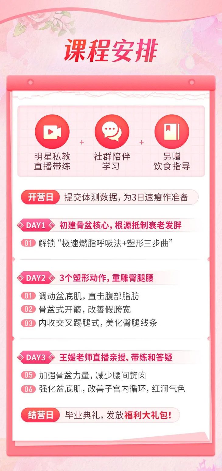 以修复骨盆为核心,结合柔韧拉伸+肌肉塑形+呼吸法,达成矫正骨盆→提升代谢→畅通气血的作用,打造出苗条身材、红润肤色、不老体质。