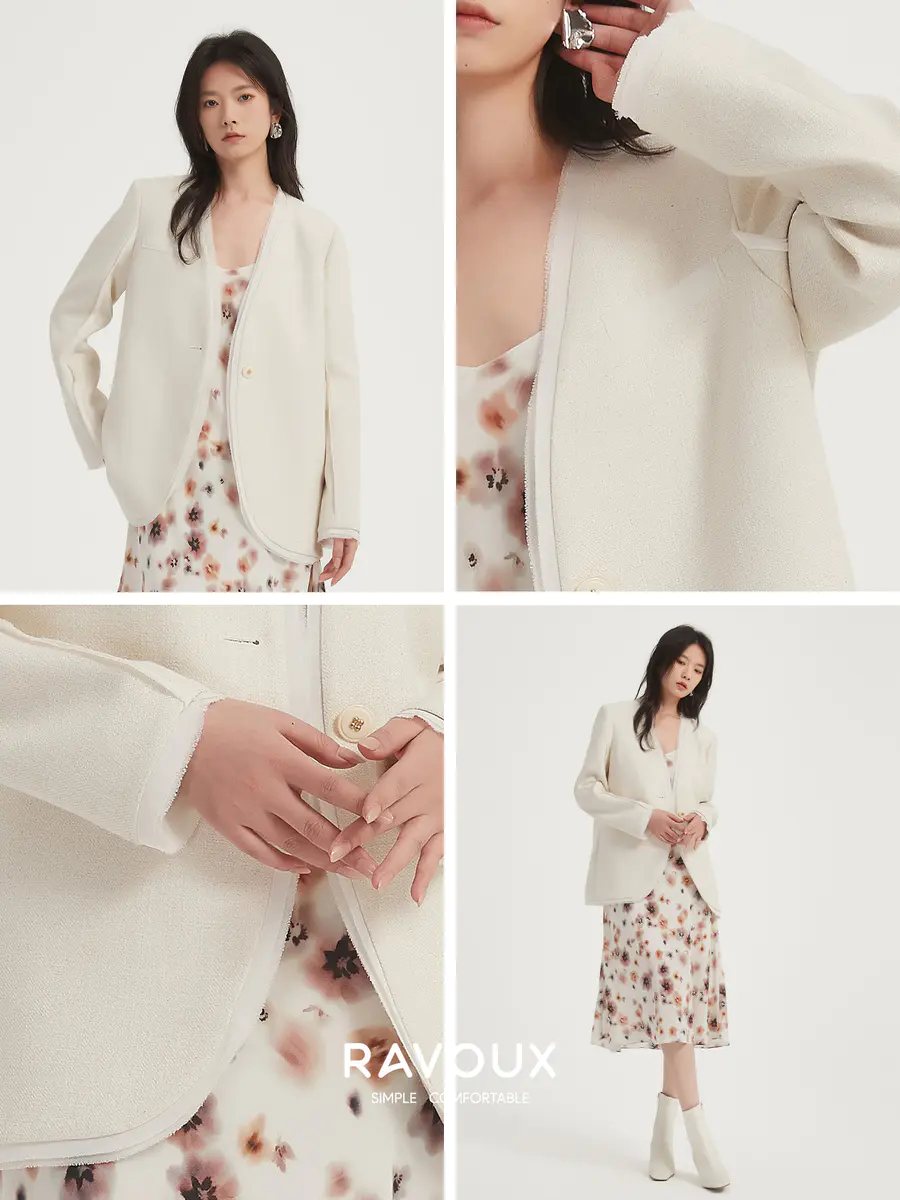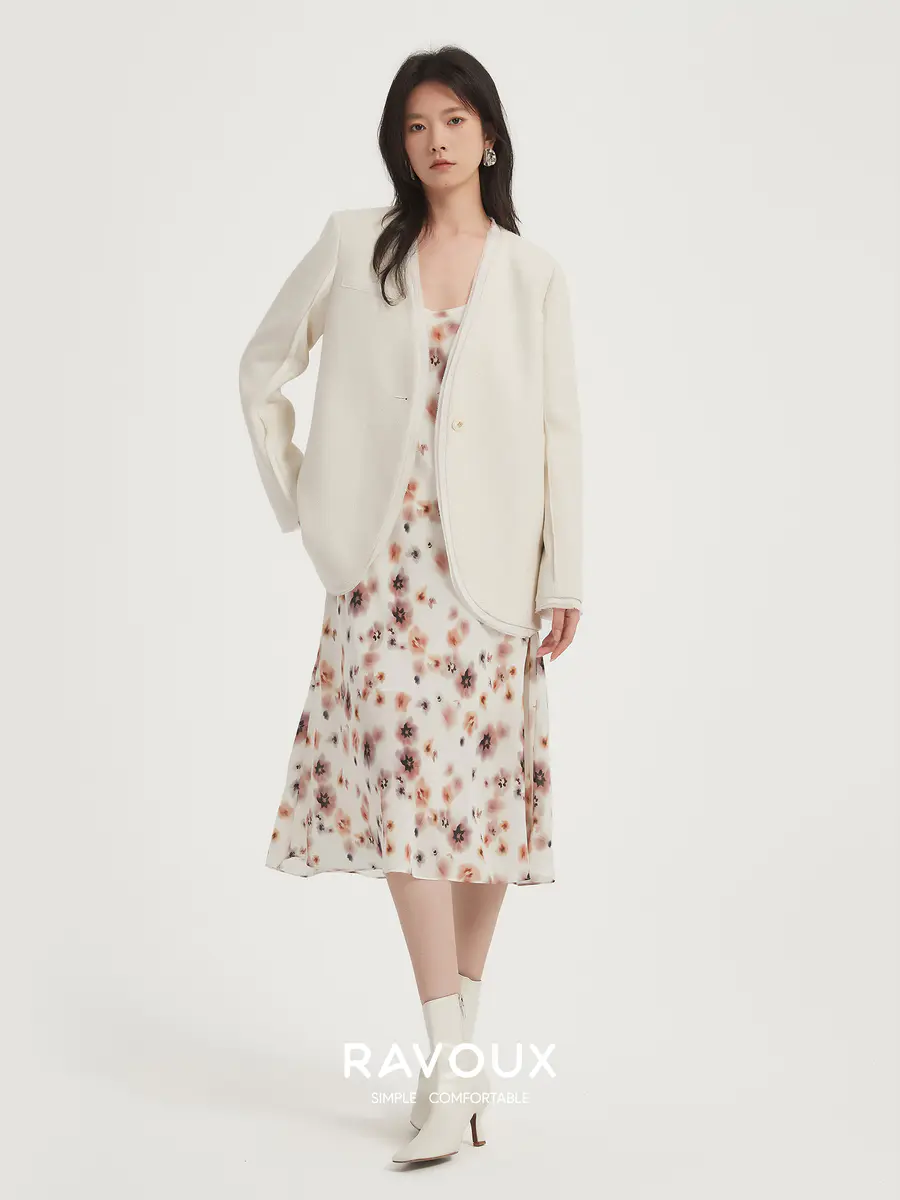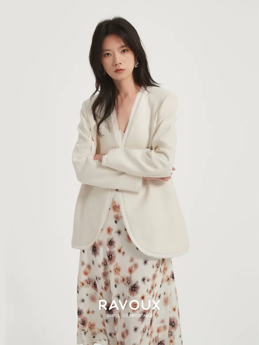早春极简主义|V领一粒扣拼接网纱亚麻西装