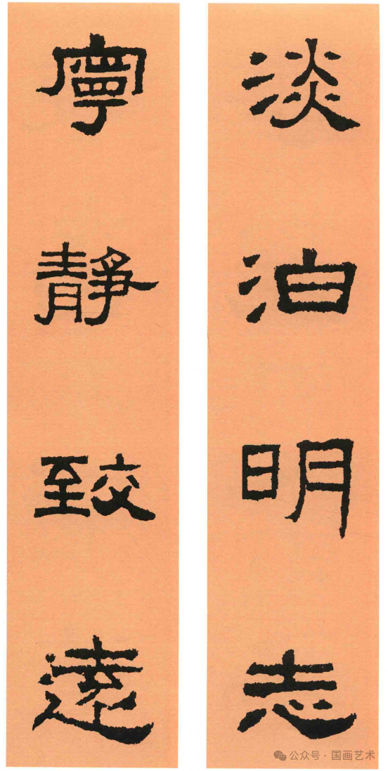 方笔为主:笔画以方笔为主,笔力强劲雄壮,沉着厚重,古拙劲道,苍浑朴茂。横画两端都见方,粗重浑厚,如“言”、“善”等字。