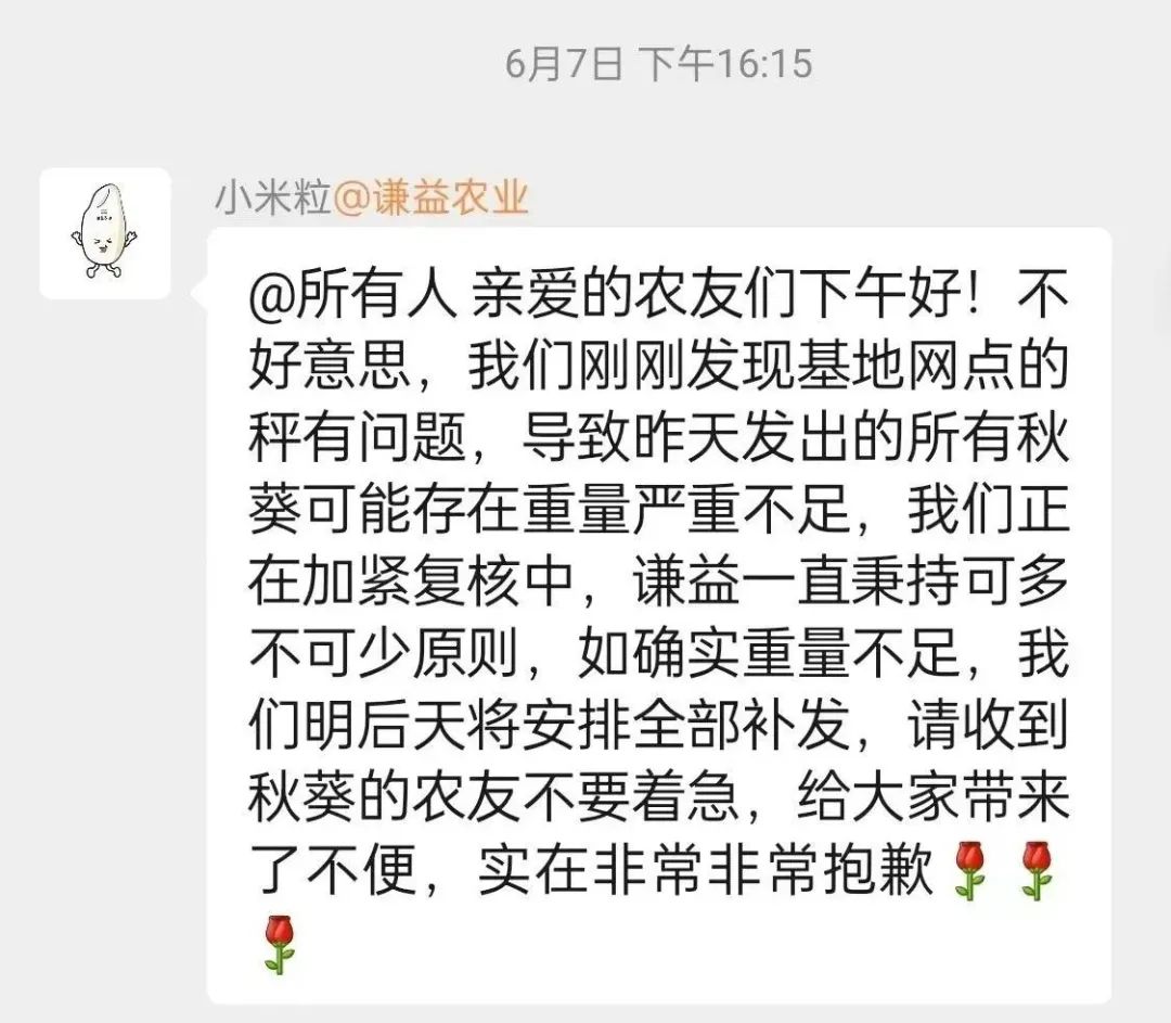 当我得知这个消息的时候,第一时间去镇里买称,结果镇上没有能精确到0.1g的称,于是我直接狂飙20公里去到市区去买称,发现网点的称果然有问题,立马给大家全额退款,并赔礼道歉。广东基地第一年,遇到了很多问题,非常感谢广东菜友们的包容和信任,谦益会努力完善相关流程,给大家带来安全健康美味的食材,夜已深,愿好梦。(欢迎大家加入广州菜友群)