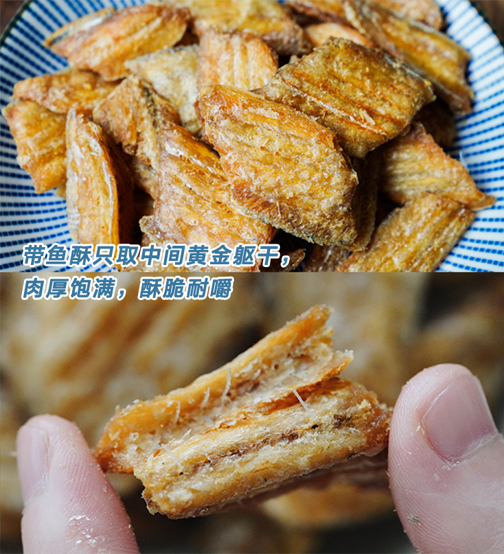 带鱼酥的口感会比黄鱼酥更扎实,但完全没干柴的感觉,掰开能看到干脆蓬松的鱼身内部,鲜香酥脆,吃了手都停不下来。