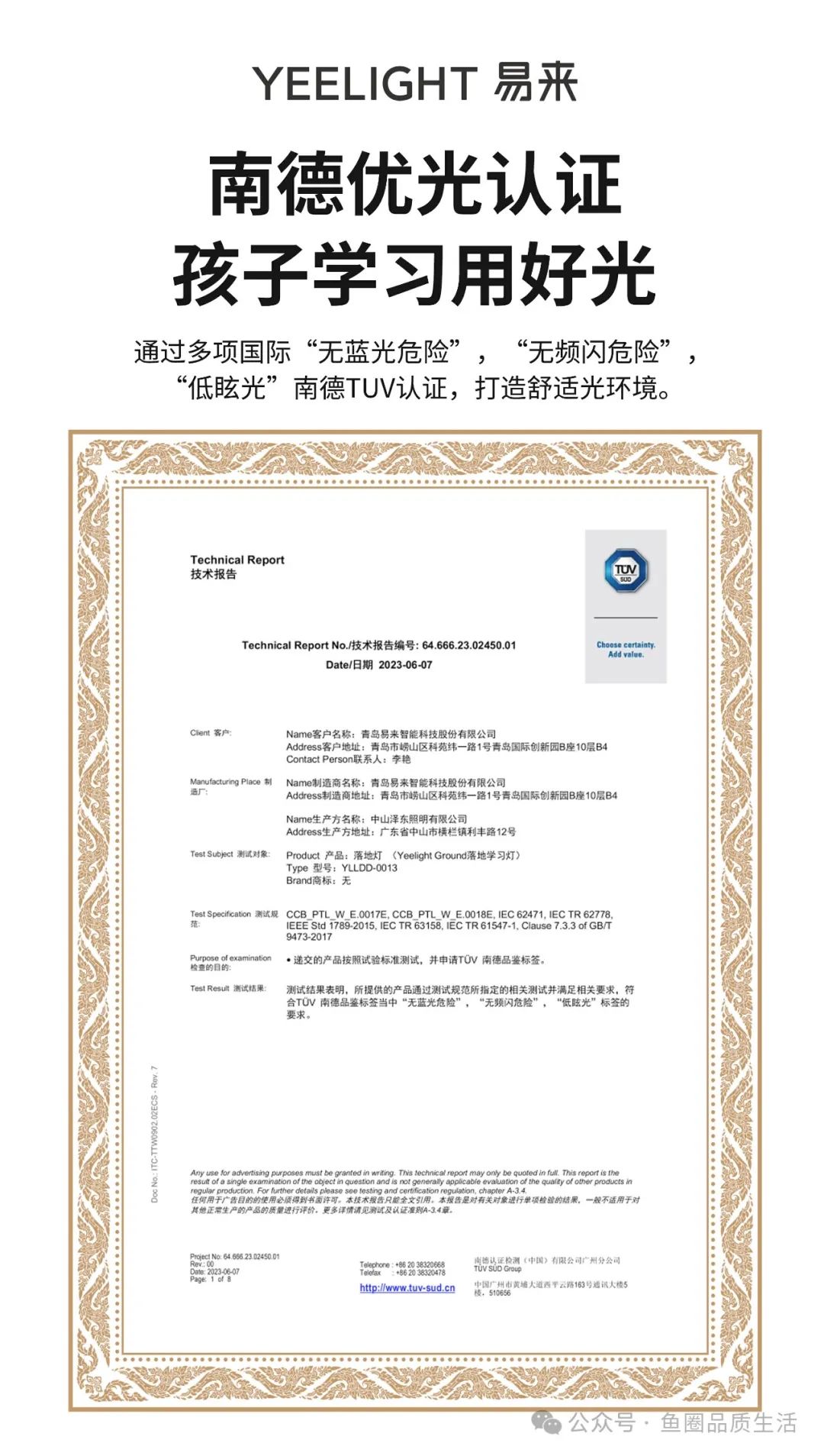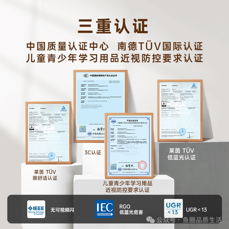 而且他家不是普通的检测,而是通过国内外多项近视防控、CQC、南德莱茵TUV、3C等三方认证,频闪、眩光、蓝光通通不用担心,可以安心用。