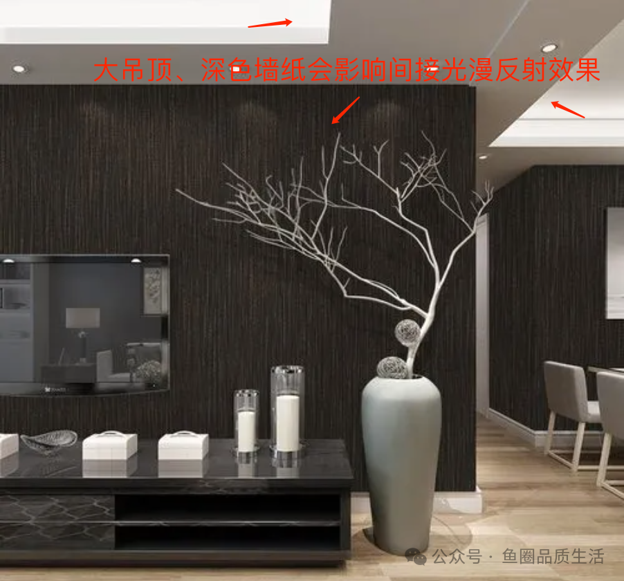 比如家装上有较深的C字形吊顶、深色墙纸、层高过高(大于3.5以上),都会影响大路灯间接光的漫反射效果,也就体现不了大路灯的优势,做唯一光源可能亮度不够。