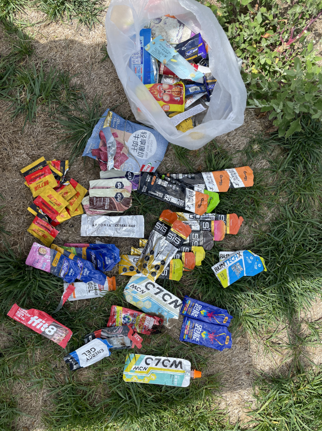 一袋能量胶大约70克重, 能量胶皮则不足10克,一张保温毯50克,一个空的500毫升空塑料瓶的重量大约是20克。1.5吨的垃圾如果堆在一起,其势蔚为壮观。