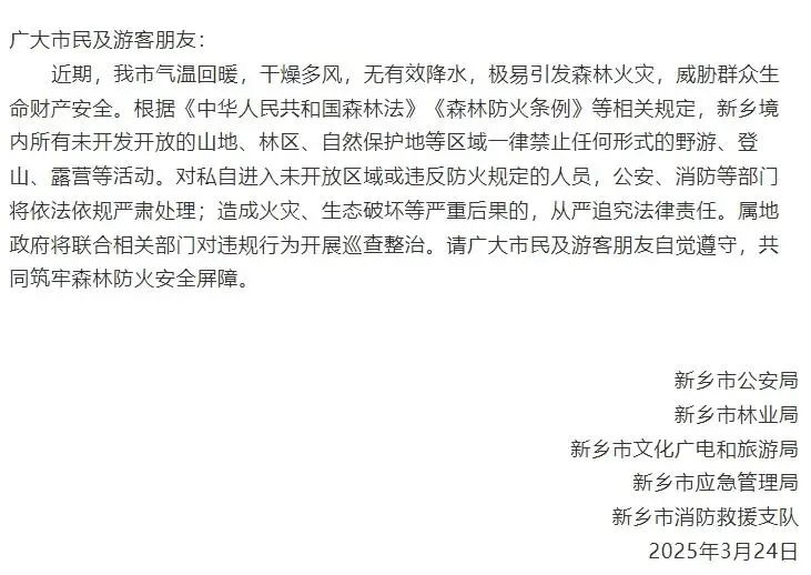 火灾发生后,3月24日,新乡市公安、林业、文旅、应急等多个部门联合发布关于加强山区野游管理的提示。提示称,近期当地气温回暖,干燥多风,无有效降水,极易引发森林火灾,根据《中华人民共和国森林法》《森林防火条例》等相关规定,新乡境内所有未开发开放的山地、林区、自然保护地等区域一律禁止任何形式的野游、登山、露营等活动。同日,辉县市发布全市范围内的野外禁火令,即日起至2025年5月15日止。