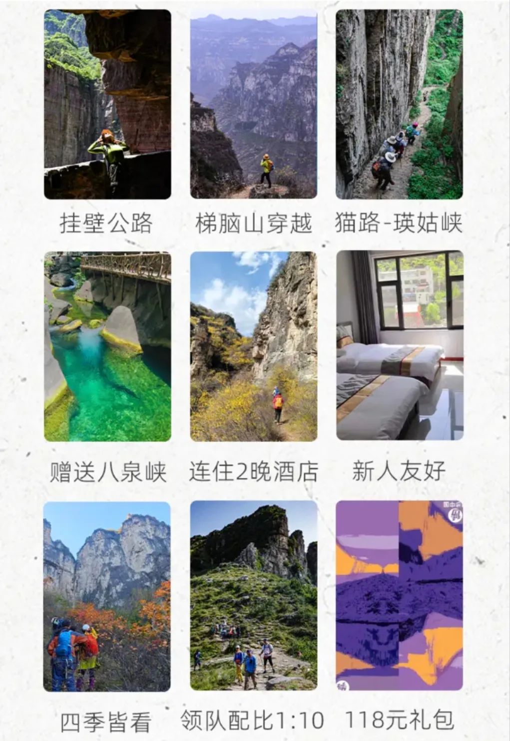 1条南太行最负盛名的挂壁公路-郭亮挂壁公路; 2条西太行经典徒步线路-猫路-瑛姑峡穿越;梯脑山穿越; 1处西太行自然秘境-八泉峡; 以40公里轻徒步,拿下南太行+西太行!