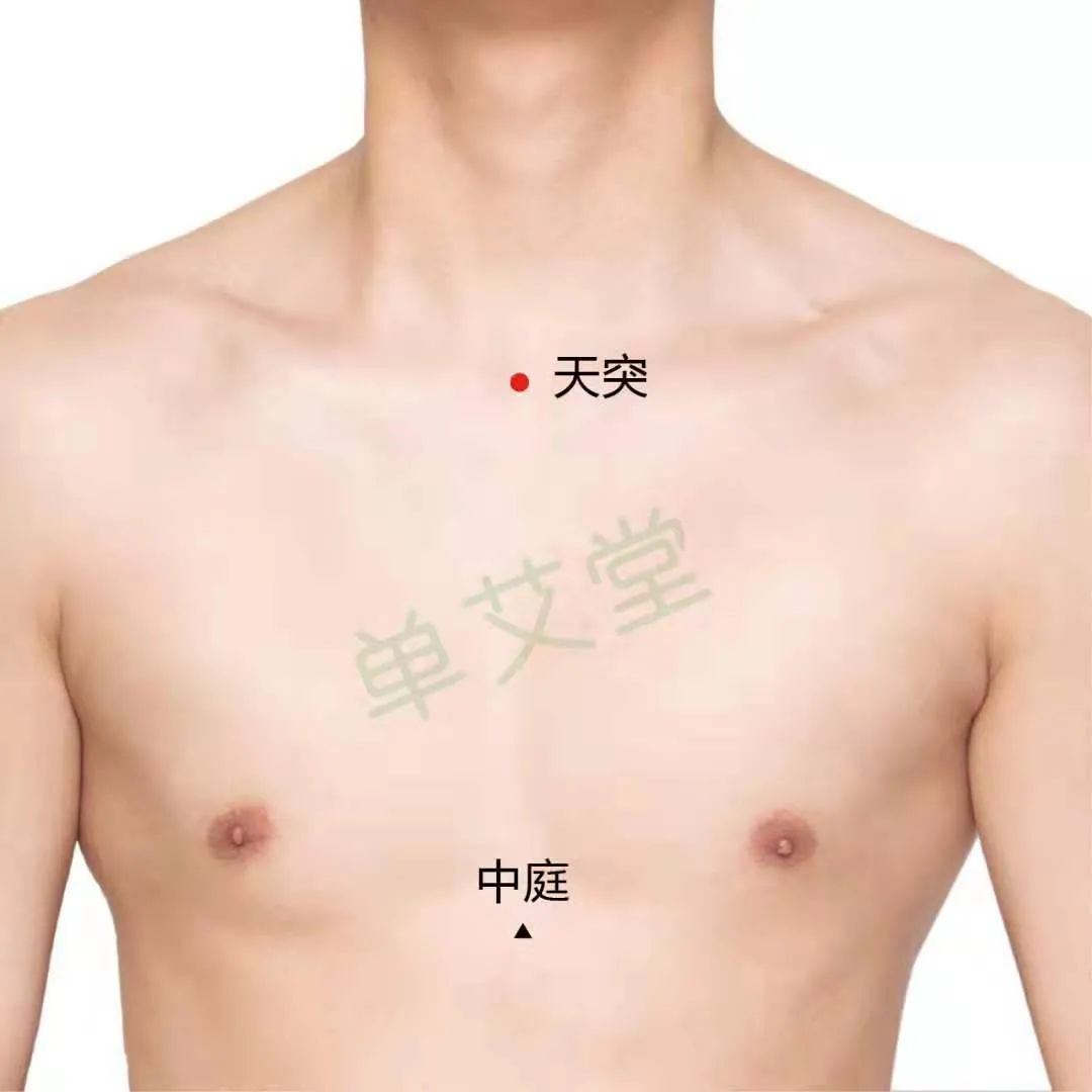 取穴:天突穴在颈部前面,两锁骨内侧、胸骨柄上缘有一个凹陷处,按起来有酸胀感。