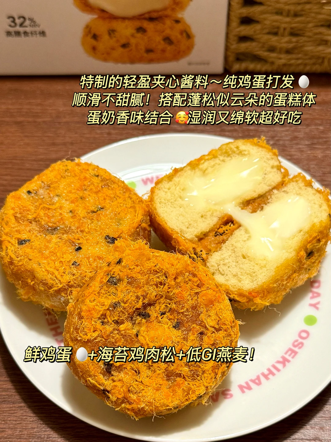 ✅外层裹满100%纯鸡肉松+优质水域海苔,满口咸香;内馅是鲜鸡蛋打发的定制慢升糖沙拉酱,轻盈顺滑不甜腻!