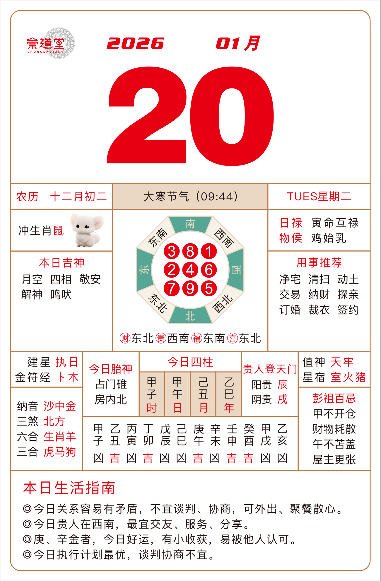 2026年1月20日 农历十二月初二 甲午日 冲鼠