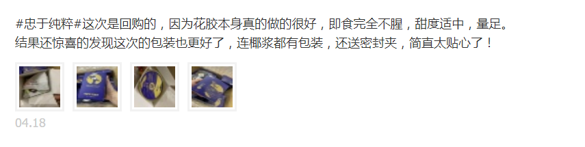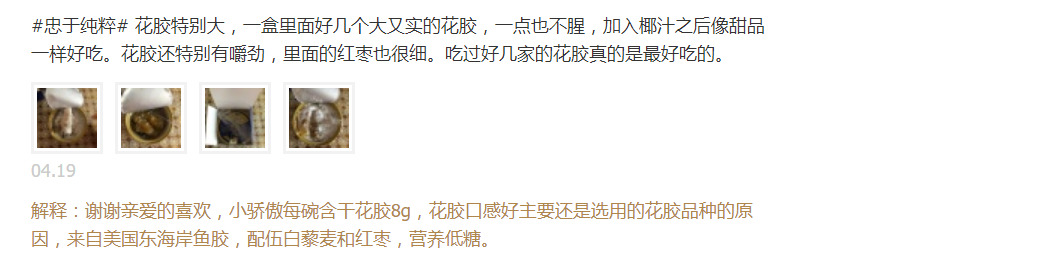 当然还有热量、产品规格、储存方式等的区别,在这里我就不作赘述,大家直接看商品详情页就好。虽然我个人偏爱娇金汤花胶,但个人喜好难以概全,从目前大家对产品的一致好评上来看,也的确是这样。
