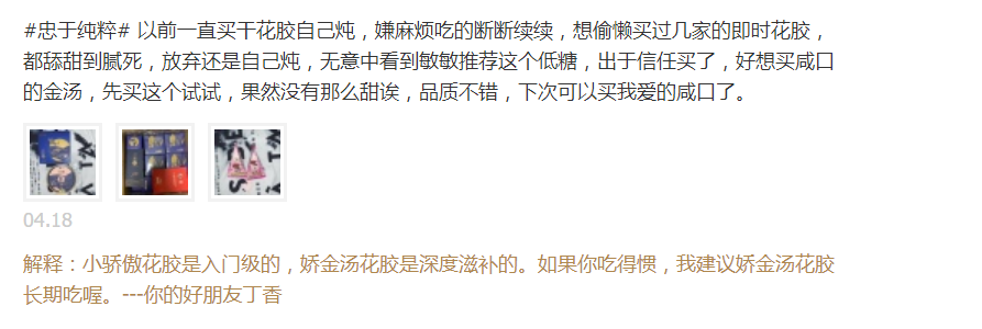 周日我们线下体验店掌柜雪雪来找我,和我说她要长期进补小娇傲花胶,原因就是一点没有吃出腥味。之前我让她多吃娇金汤花胶都被婉拒。基于此,从口味上娇金汤花胶可能更适合我们南方的朋友,小娇傲红枣藜麦花胶更适合北方和南京等地区的朋友。