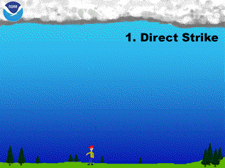 直雷击是最常见也是危害最大的雷击形式。在雷雨天气下,闪电直接进攻人体。高达几万到十几万安培的雷电电流,从头顶穿透,通过双脚流入大地。这种雷击情况一般伤势较重,严重会直接致死。