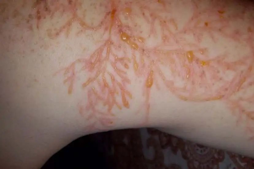 雷击后,毛细血管破裂红细胞进入表皮形成的“利希滕贝格图”