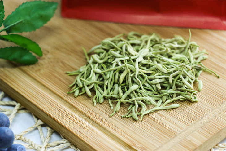 制成后的干品金银花,花蕾形状上粗下细,周身有密集短绒毛,表面为绿白色,花冠厚稍硬,握之有顶手感,气清香,味甘微苦,泡发后茶色澄清,入口清甘,属品质上乘之金银花。