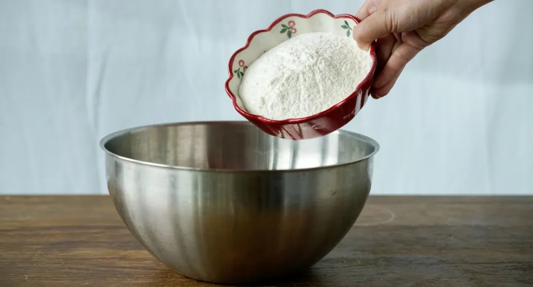 取一个大碗,加入150g中筋面粉 、1/4勺盐、