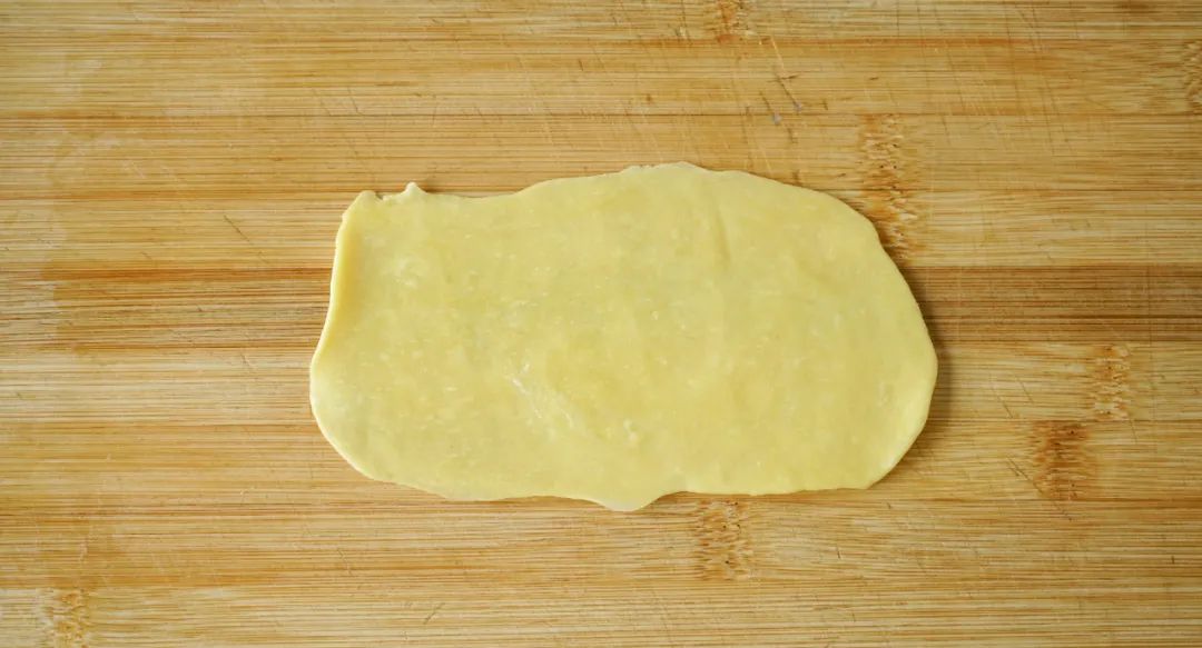 3.包馅料:砧板上抹点油,将面粉擀成薄薄的长方形。