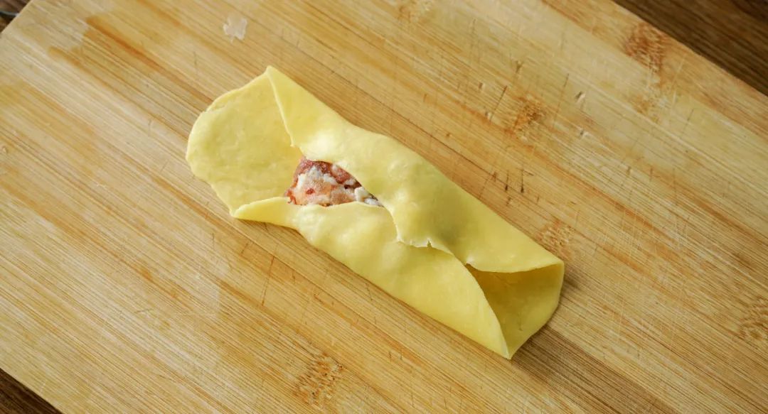 把馅料放在面皮中间,先把长的两面包起来,尽量包紧一点。
