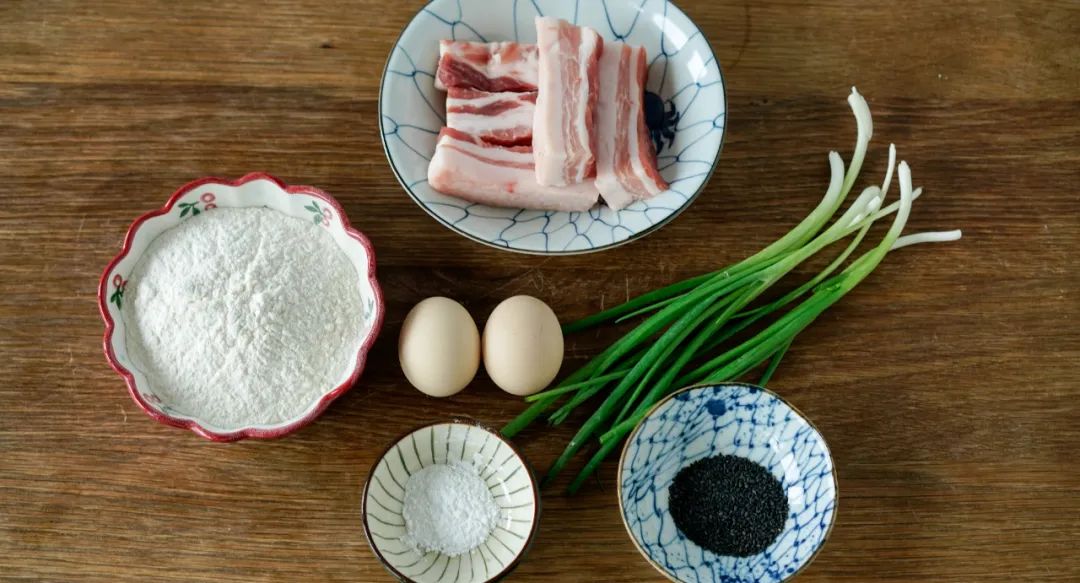 五花肉 280g / 中筋面粉 150g / 鸡蛋 3个
