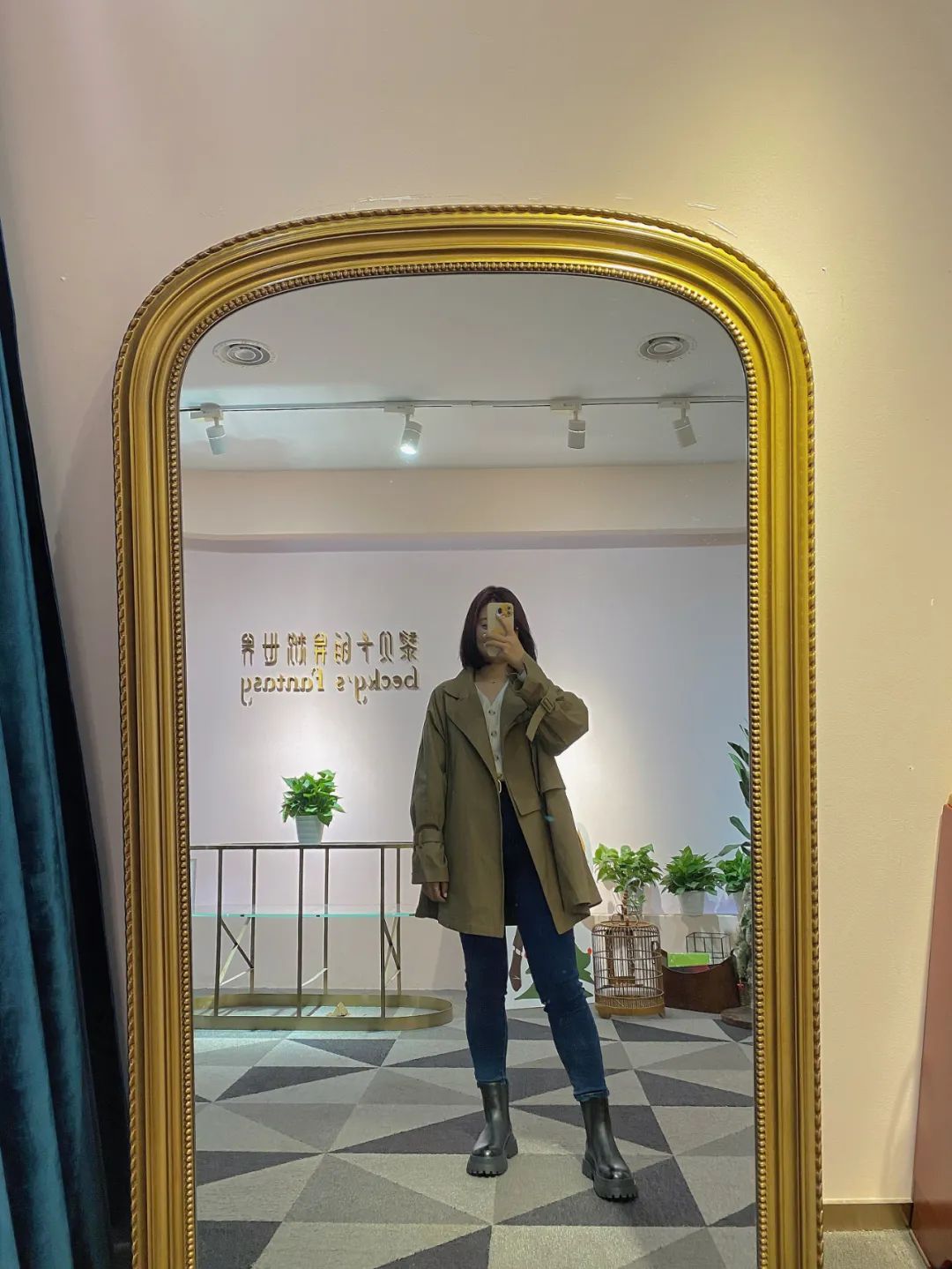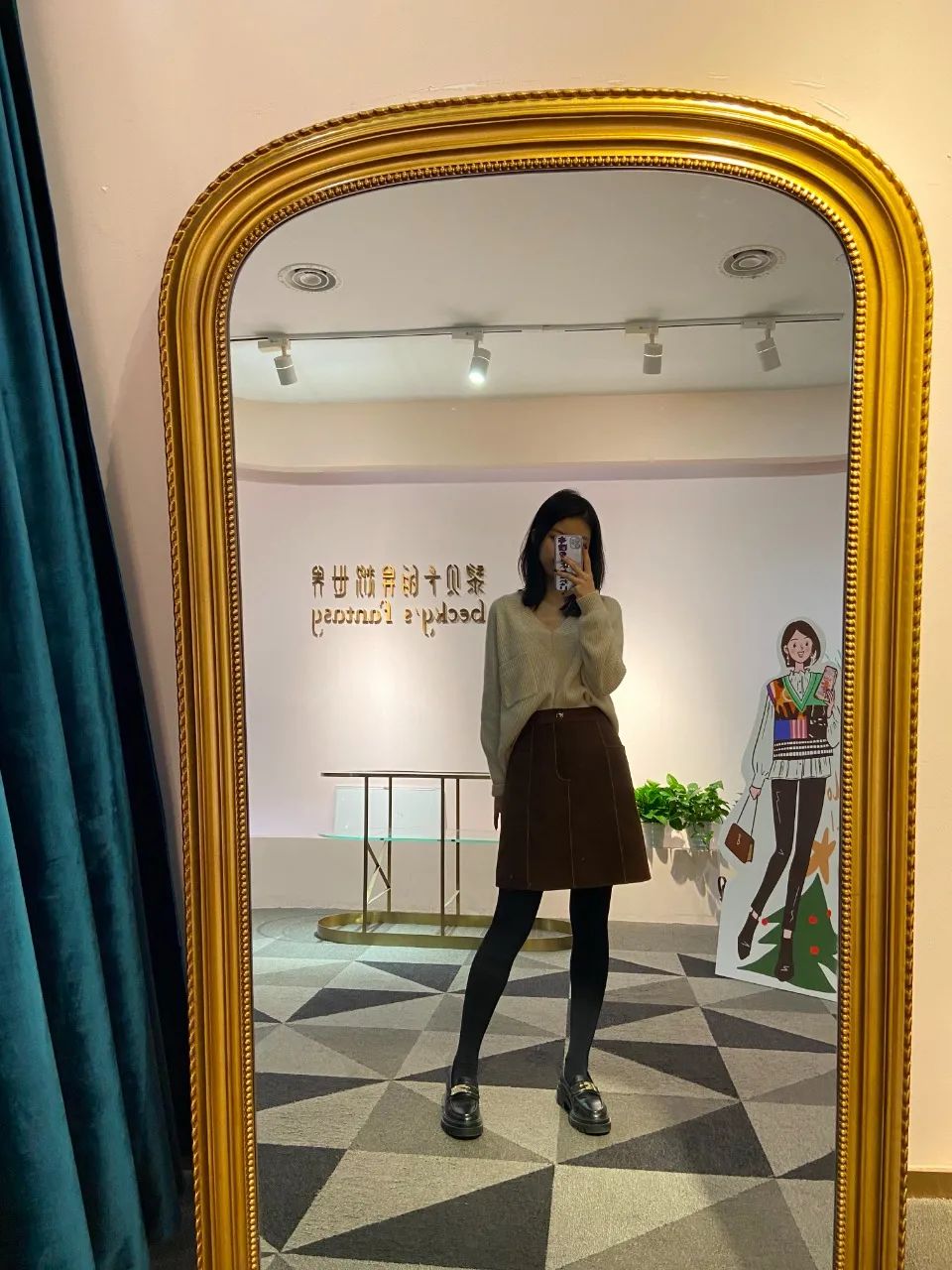 我穿了毛衣短裙,璐璐也穿上了风衣靴子,工作室的镜子太好拍了