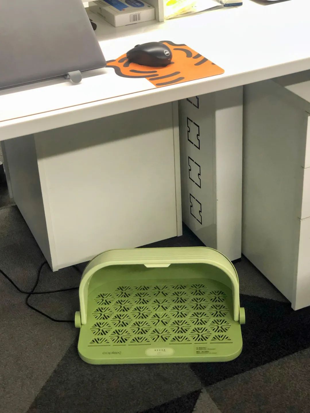 一拿到手就被它的颜值吸引,清新的浅草绿给厚重的冬天添了一抹亮色,看着心情就很好。把它放在了工位桌子底下,大小合适还有多余空间,这两天降温了开起来用温暖不说,还意外地治好了跷二郎腿的毛病