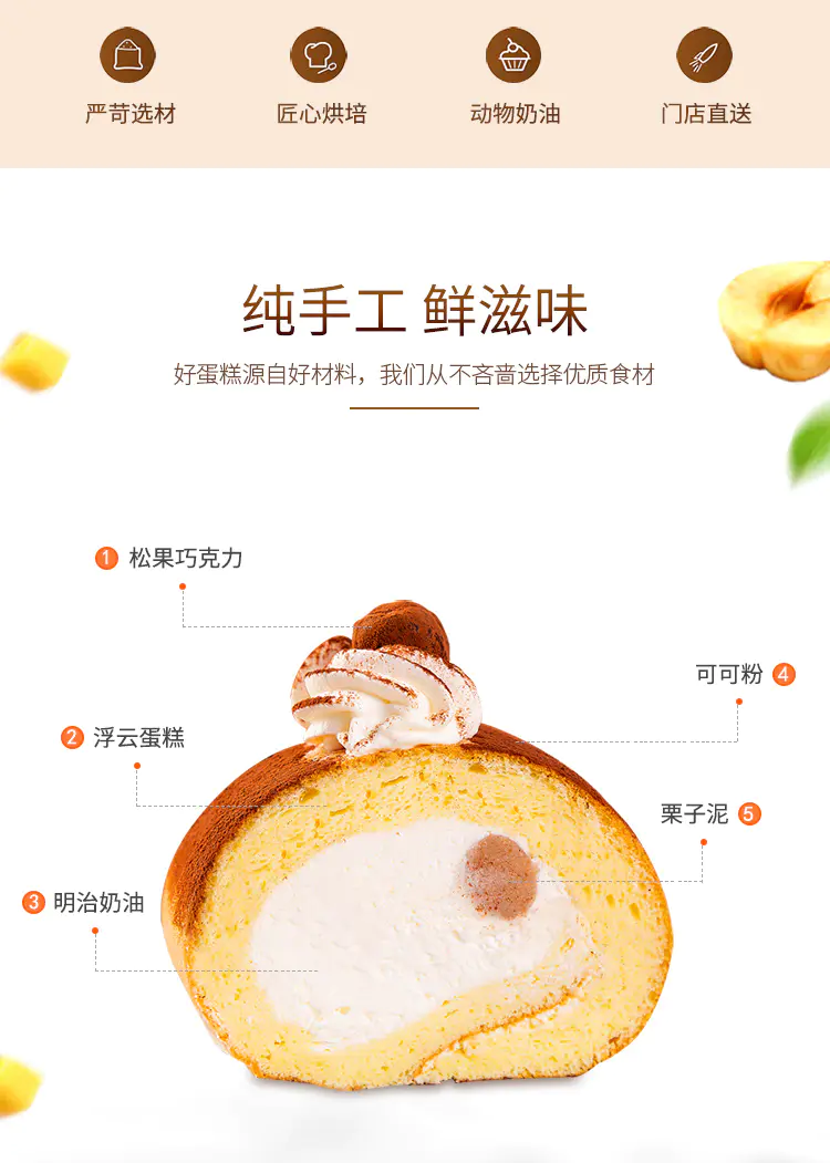 🌰栗子浮云卷 栗子泥包裹在糕体里 表面撒上可可粉,还有松果巧克力点缀。
