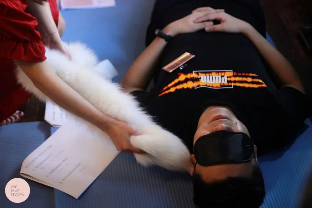 在五感练习中,Nancy和Laura老师在现场教学“阅读、滴la、轻抚、sheng缚、玩具、按摩”六种五感唤醒技巧,从实践练习中去体验“全身心的身体关照”。