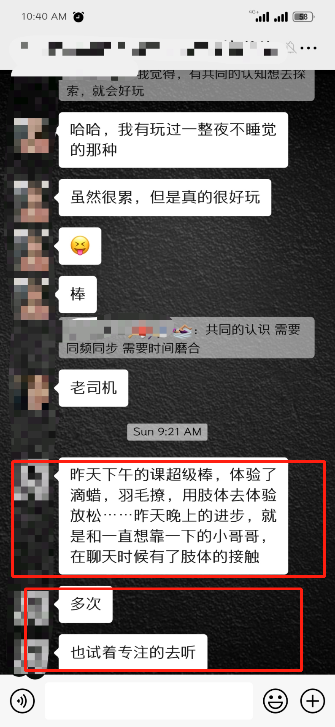父母那一代人经过一辈子的性压抑和互相磨合,最终老来做个伴儿。我对性的探索过程就像点着一支蜡烛,穿越黑暗的迷雾森林:生怕热情太高,一下子烧完了。又怕火苗太小,一股风吹灭了。我喜欢性给我的快乐,又害怕热情过后带来的伤痛和空虚。在这个课程上我终于发现了很多跟我一样的人,大家并肩而行令我欣喜而感动,老泪纵横。