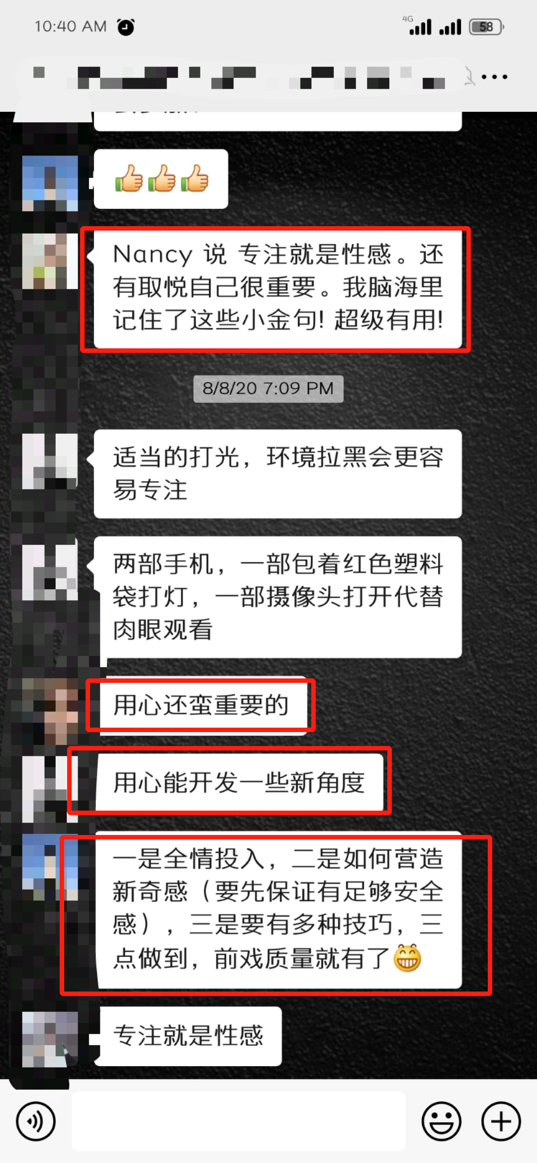 课上让我为之触动的环节,要数大家分组讨论“我最讨厌伴侣做的前戏”环节,一个女同学有点不好意思地小声说出一点“我最讨厌男生直接上手,用手指cha入且不剪指甲”,然后人群中突然冒出一声附和“加一”,接着“加二”、“加三”…