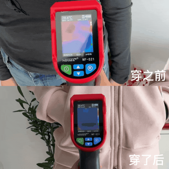 原本28℃左右,穿上羊毛蚕丝卫衣后,立马上升到了37左右黄金体温,具备非常优秀的保暖性。