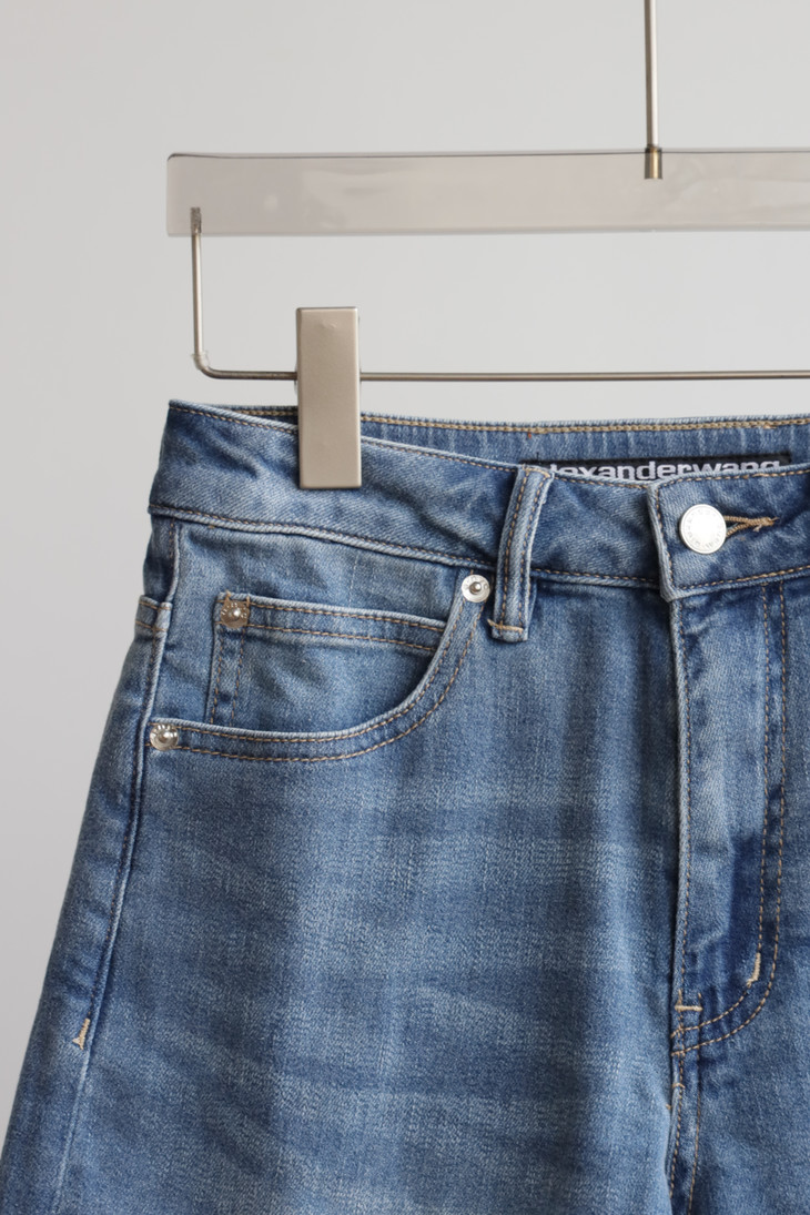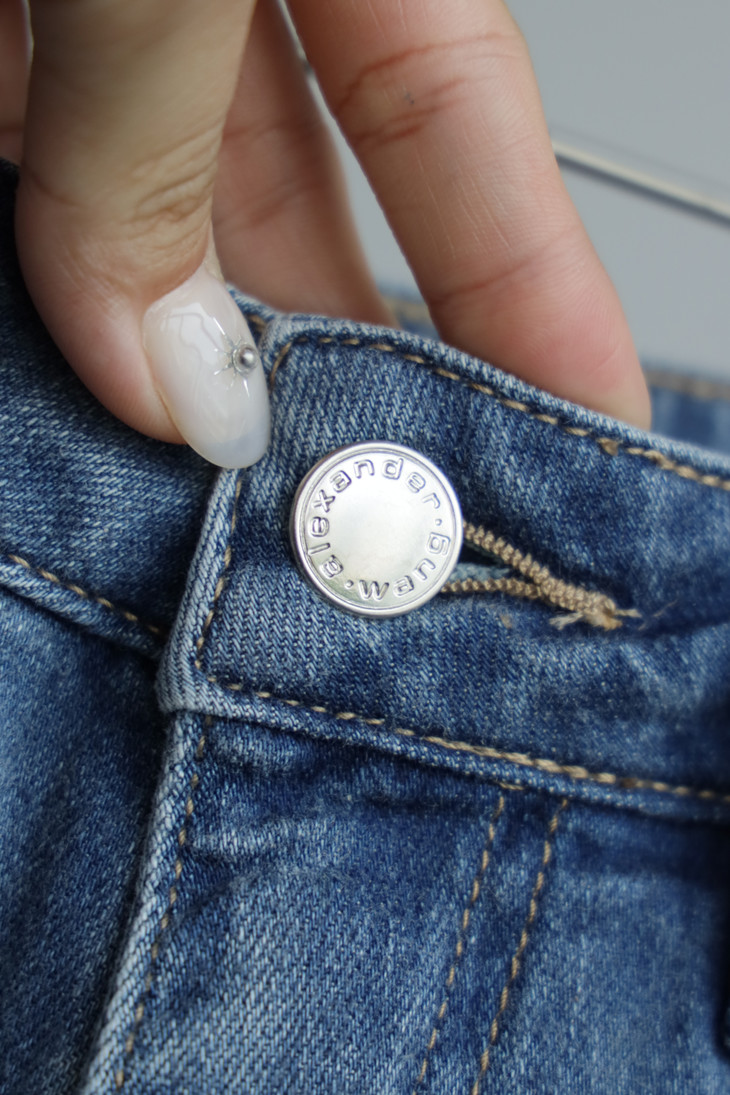 定制进口弹力混纺牛仔面料,双重酵素洗水经典浅蓝磨白。对称翻盖式铆钉按扣口袋,后幅竖型口袋,工装风个性与Xing感兼具。