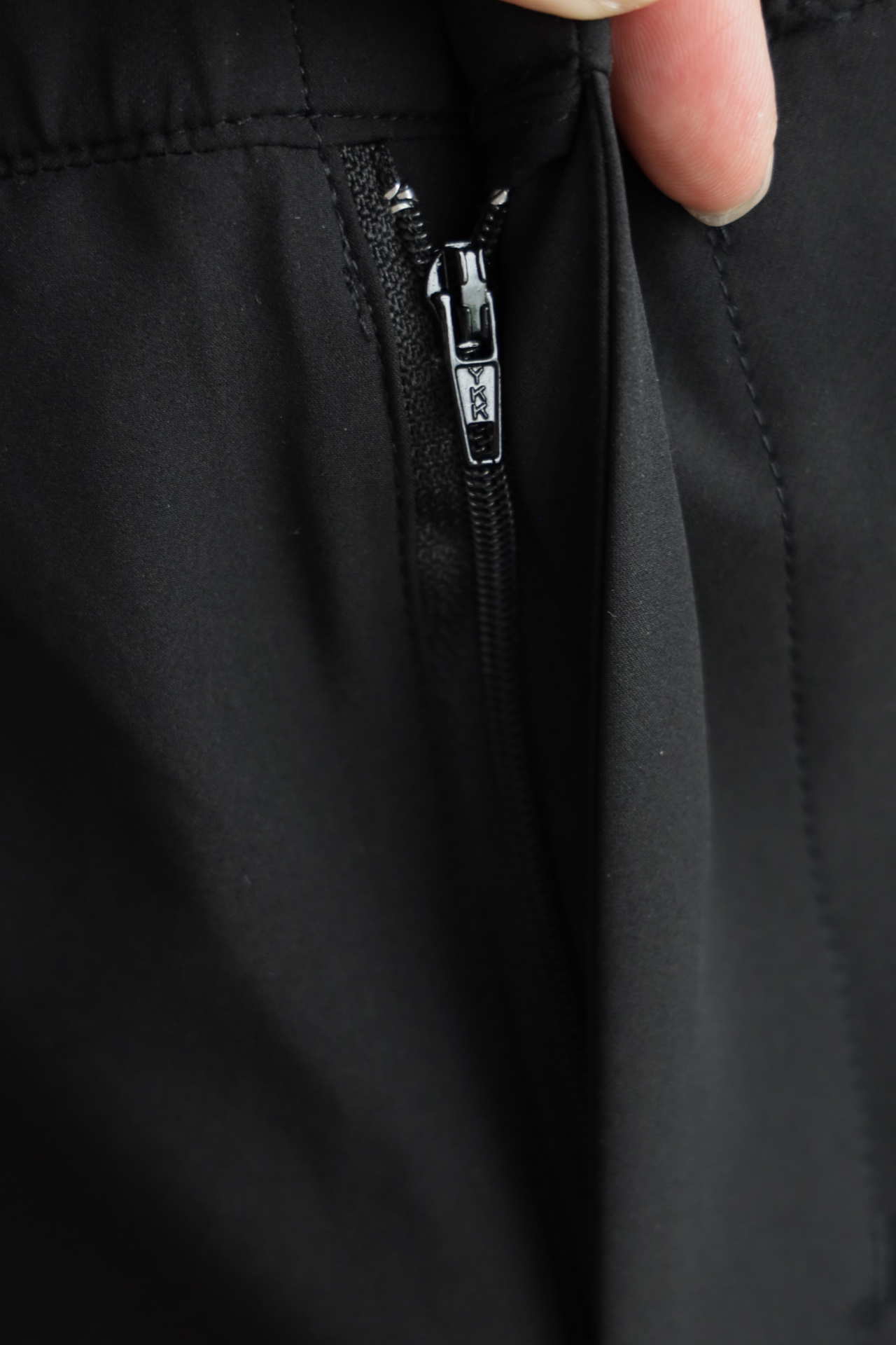 拉链门襟+双侧加深插袋,后屁股口袋带拉链,裆部三片立体拼接